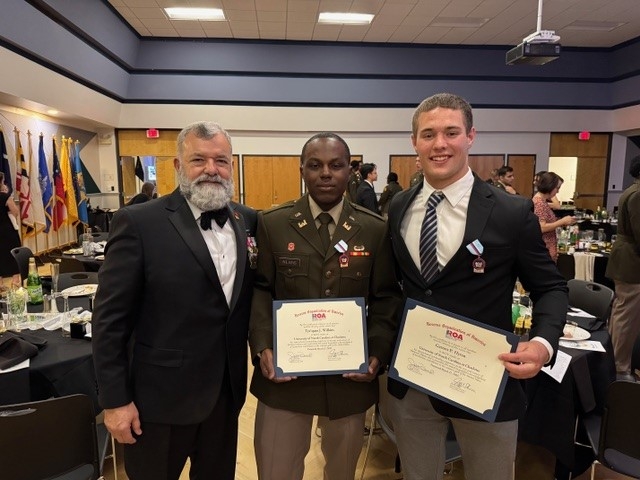 Department member Brigadier General Ferdinand Irizarry presented the ROA gold medal and award certificate to cadets R.J. Wilkins and C.F. Hyten at the UNC Charlotte Army ROTC awards banquet on 27 March 2025.