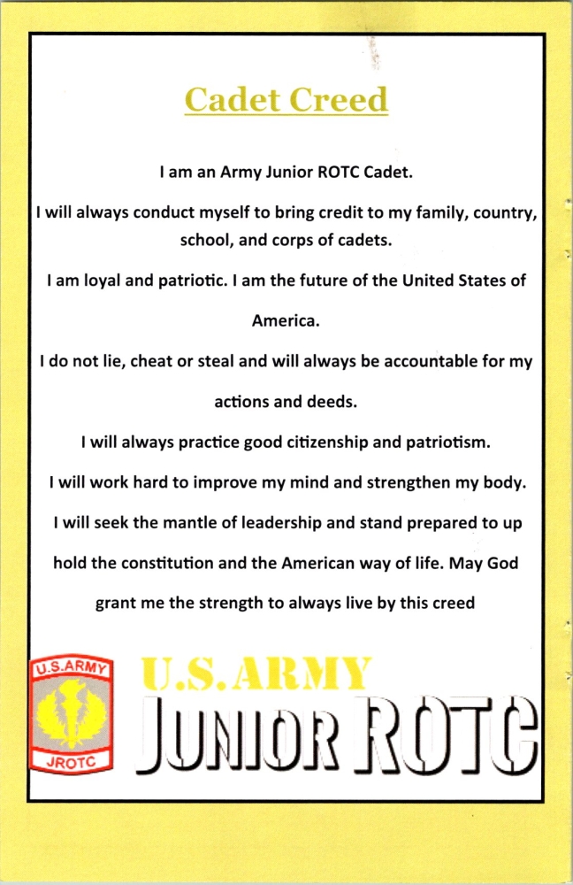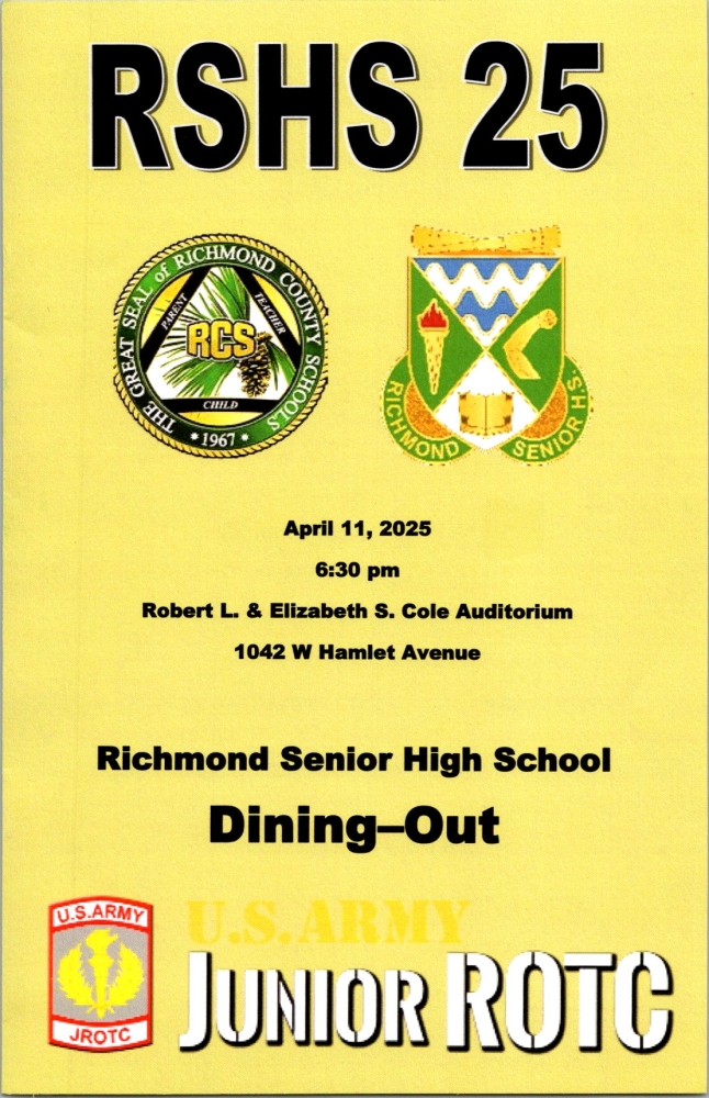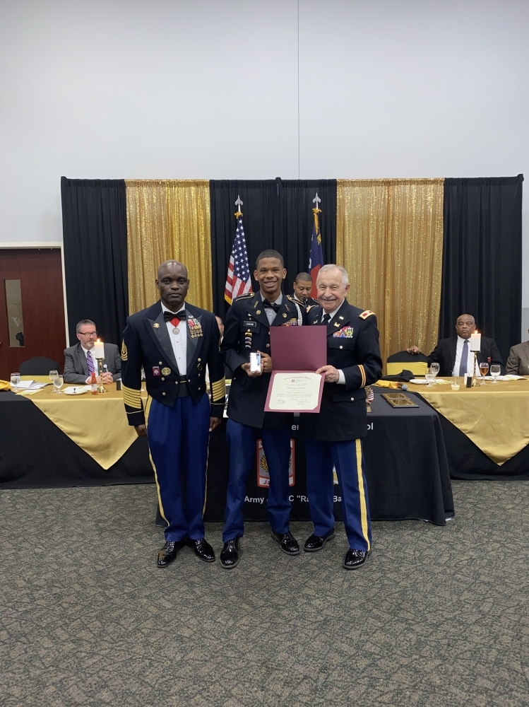 COL Iggi Husar, Department President, presented the JROTC Award Certificate and Medal Set to Cadet Dominique Lerand at the Richmond Senior High School dining out event in Cole Auditorium, Richmond County.