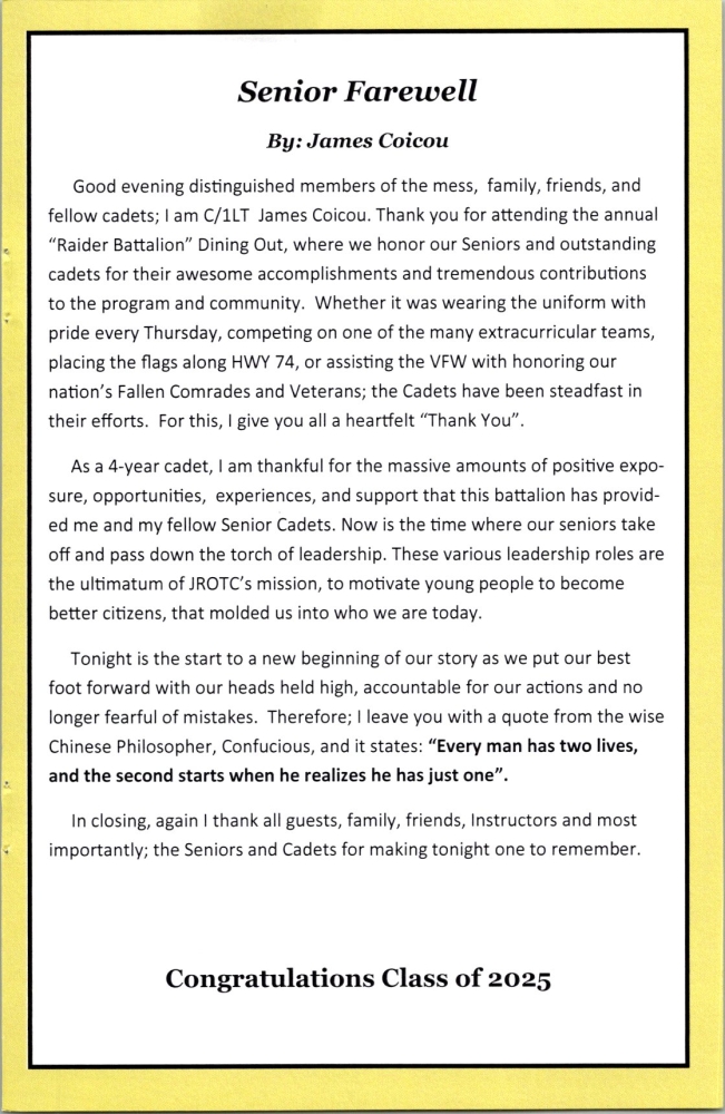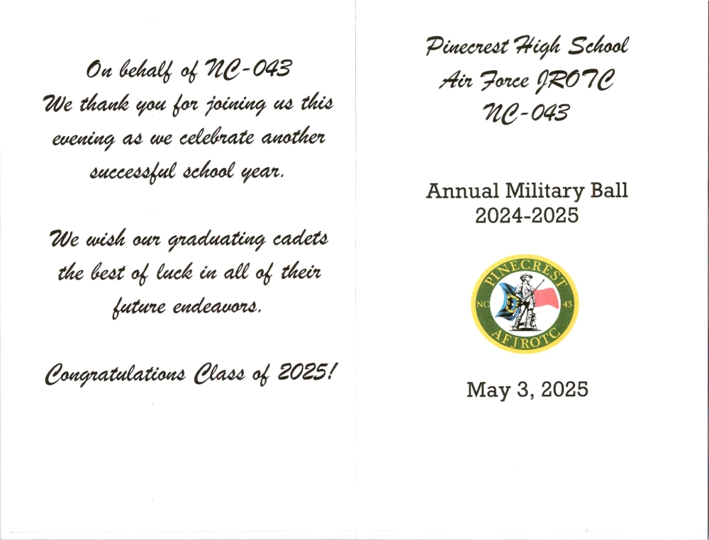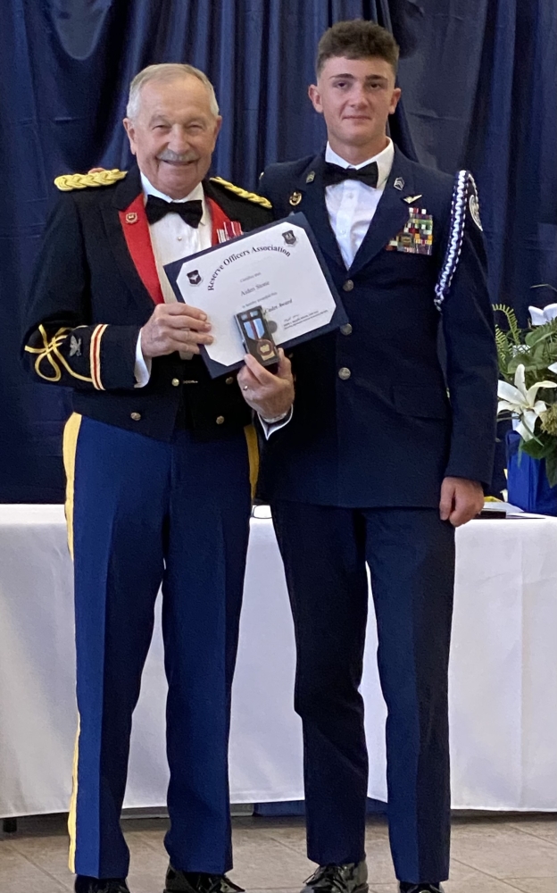 Pinecrest High School of Southern Pines, NC held its annual Military Ball honoring their Air Force JROTC Cadets on 3 May 25 at Sandhills Community College, Dempsey Student Center. COL Iggi Husar presented the ROA JROTC certificate and medal to Cadet Aiden Stone.